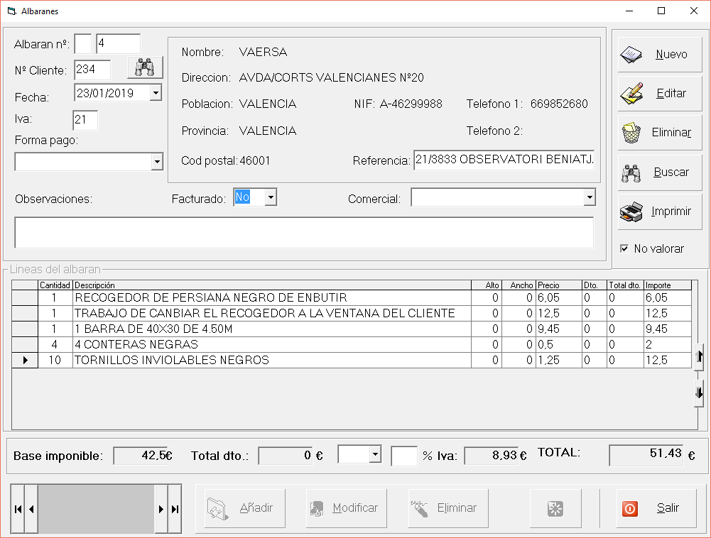AYUDA MetalSoftDesde la pantalla de albaranes podemos crear, modificar y eliminar los albaranes emitidos a clientes. Atención desde esta pantalla solo se pueden hacer albaranes manualmente, es decir no podemos utilizar los productos o presupuestos ya creados para hacer nuevos albaranes, para hacer una albaran partiendo de un presupuesto lo hariamos desde la pantalla de Presupuestos .