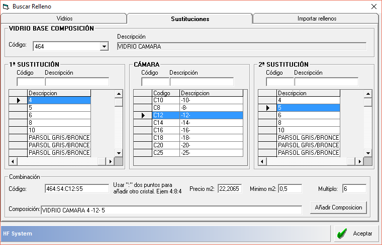 La segunda es la pestaña "Sustituciones" donde podremos elegir la combinación de vidrio de cámara que deseemos, para ello tenemos que tener introducido en el cuadro de texto de "VIDRIO BASE COMPOSICIÓN" el código del vidrio base, es decir el vidrio que tiene el precio de partida y al que le iremos sumando el precio de las distintas sustituciones o cámaras. Después solo tendremos que elegir la combinación deseada y el programa nos generará un código de combinación que generará el precio de la suma de toda la combinación. Pulsaremos Aceptar para usar la combinación en el presupuesto. Opcionalmente podemos guardar la combinación como un vidrio de cámara pulsando el botón de "Añadir composición", aunque no es necesario.