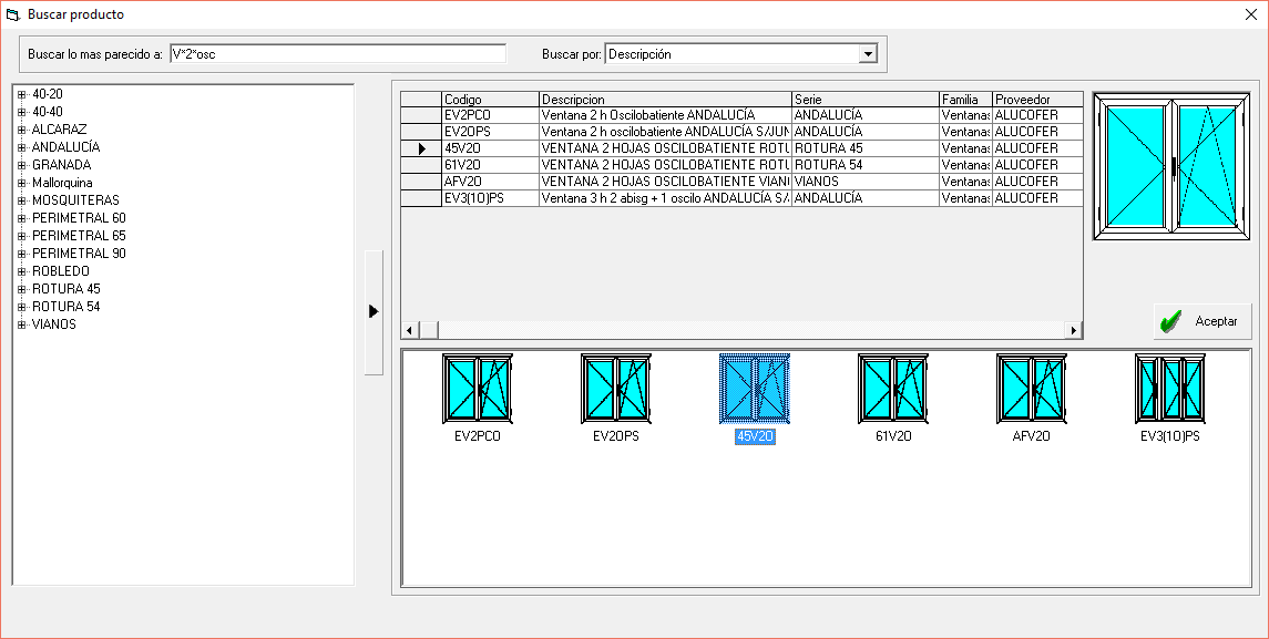 AYUDA MetalSoftBusca productos de despiece. Puede seleccionar la serie desde la pantalla izquierda o bien teclear en el recuadro superior para filtrar los resultados. El programa filtrará y ordenará los resultados por la opción elegida en el desplegable "Buscar por:". Adicionalmente puede usar el asterisco "*" como comodín para realizar búsquedas complejas sin necesidad de escribir todo el texto de lo que esté buscando, por ejemplo, podría buscar todos los productos de 2 hojas oscilobatientes buscando por descripción y tecleando "*2 h*osc". Seleccione el producto deseado y pulse Aceptar para cargar el producto en la pantalla de Cálculo de precios .