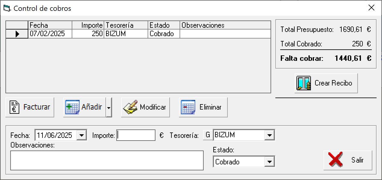 Facturar: Genera la factura para el cliente asociado al presupuesto de este recibo, los importes correspondientes se traspasarán automáticamente a los cobros de dicha factura.