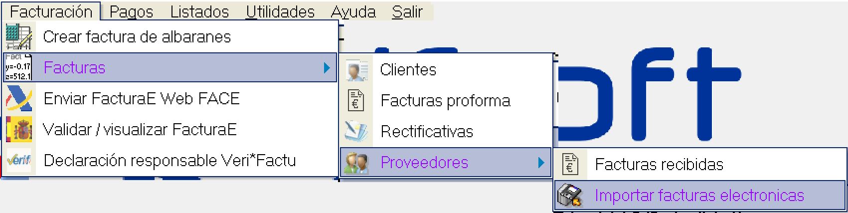 Ademas de introducir las facturas de proveedores desde la pantalla manualmente, tambien se pueden introducir facturas electronicas en formato xml firmado xsig, es decir, el formato FacturaE. Para ello debe de tener todas las facturas en una carpeta e indicarle al programa la ubicacion de esa carpeta desde el Menú superior como indica la imagen inferior.