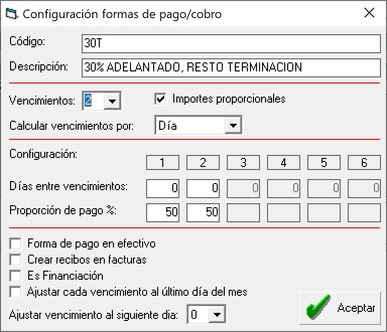 Selecciona la forma de pago / cobro deseada y pulsa "Modificar" para configurar las siguiente opciones:
