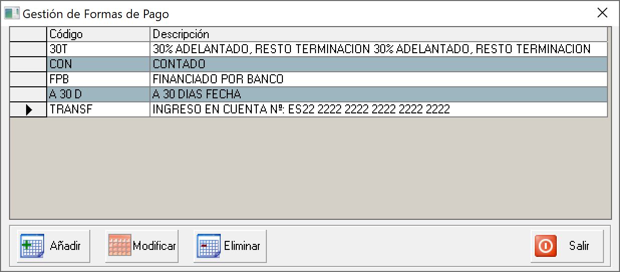 AYUDA MetalSoftDesde el Menú superior "Pagos": "Formas de pago", accedemos al listado de formas de pago / cobro del programa. Ahi podremos crear, modificar o eliminar la forma de pago / cobro deseada.