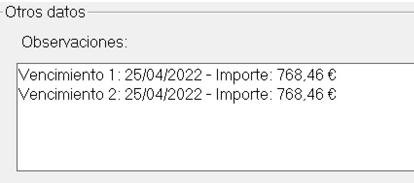 Los vencimientos generan un texto en las observaciones de presupuesto o facturas indicando los importes correspondientes a cada vencimiento. Estos se puede modificar / eliminar manualmente en dichas observaciones.