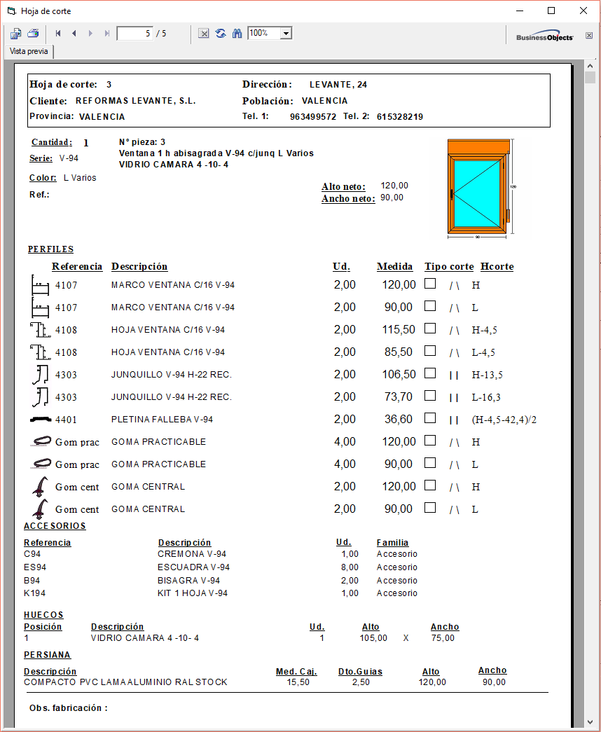 Listado de cristales con las medidad de alto y ancho, y si llevara barrotillo la distribucion de