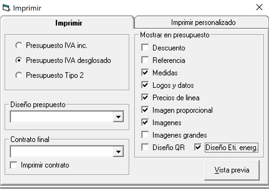 Si activa la casilla Diseño Eti. energ. podra usar el diseño de presupuesto con la etiqueta energetica integrada si previamente a generado esta etiqueta en la pantalla de calculo: