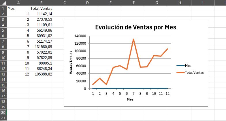 Grafico de evolución de ventas en la exportación a Excel Anual: