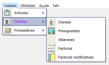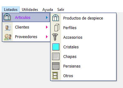 AYUDA MetalSoftPara acceder a los listados tenemos un menú en la parte superior que nos permitirá crear listados de todo tipo. Las opciones de filtrado entre clientes, proveedores, artículos, etc. cambian y se adaptan al tipo de datos del listado a mostrar.