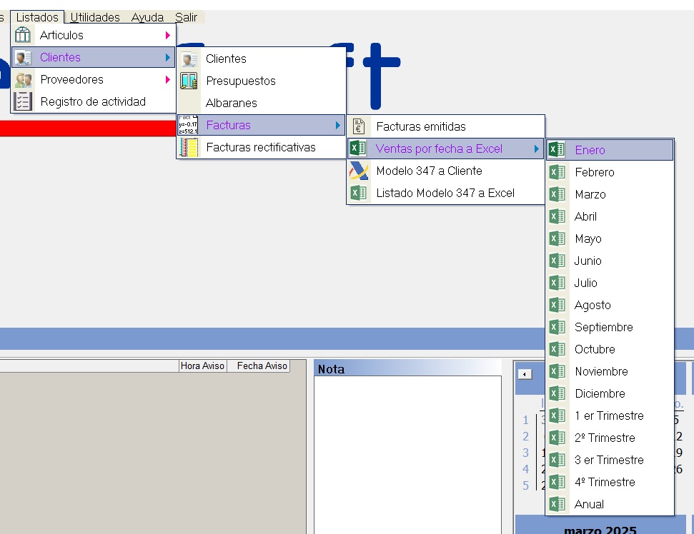 Listados de exportación rapida de facturas a Excel: Mensuales, trimestrales y Anuales. Incluye Facturas y Facturas Rectificativas. Exporetación de clientes Mod. 347 y documento para cliente.