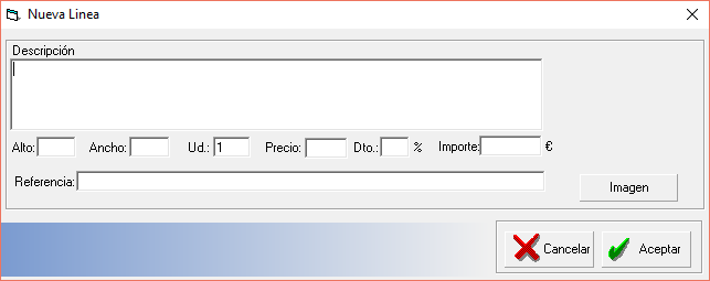 Escriba el texto, medidas, precio etc. que deseé, ademas opcionalmente puede elegir una imagen en formato BMP y pulse Aceptar para añadir la linea manual al presupuesto.