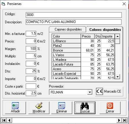 Colores disponibles: Precios de la persiana en los distintos colores o acabados. Para que el programa utilice estos precios la casilla de Precio debe estar en 0€. El programa elegirá automaticamente el precio del color del productos principal. Solo a partir de las versión 4.1.23.