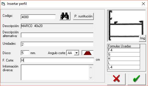 Unidades: Cantidad de cortes de la medida concreta que se va a indicar en este perfil. Además de una cantidad fija de piezas se puede usar también una formula como por ejemplo H/10 para poner una pieza cada 10 cm de alto tal y como se usa en perfiles machimbrados o lamas de mallorquinas.