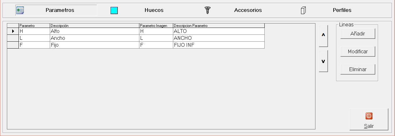 En esta sección se dan de alta las futuras medidas a las que llamamos Parámetros. Al crear el producto se crean automáticamente el parámetro "H" y "L" correspondientes al alto total y ancho total respectivamente. Se deberán crear tanto parámetros como medidas necesitemos para calcular el precio del producto. Por regla general los parámetros los llamamos con una letra, por ejemplo, cuando lleva un fijo se suele usar la letra "F". Estos parámetros se usarán para las futuras hojas de corte de huecos/cristales, perfiles, accesorios, mano de obra, etc.