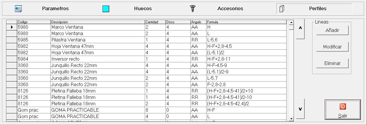 En esta sección se dan de alta todos los huecos para los futuros vidrios, chapas, paneles, etc. que necesitemos calcular con un precio por metro cuadrado. Para ello añadiremos cada hueco usan un nº de hueco o descripción, una fórmula de alto y una de ancho usando los parámetros creados en la sección de parámetros.